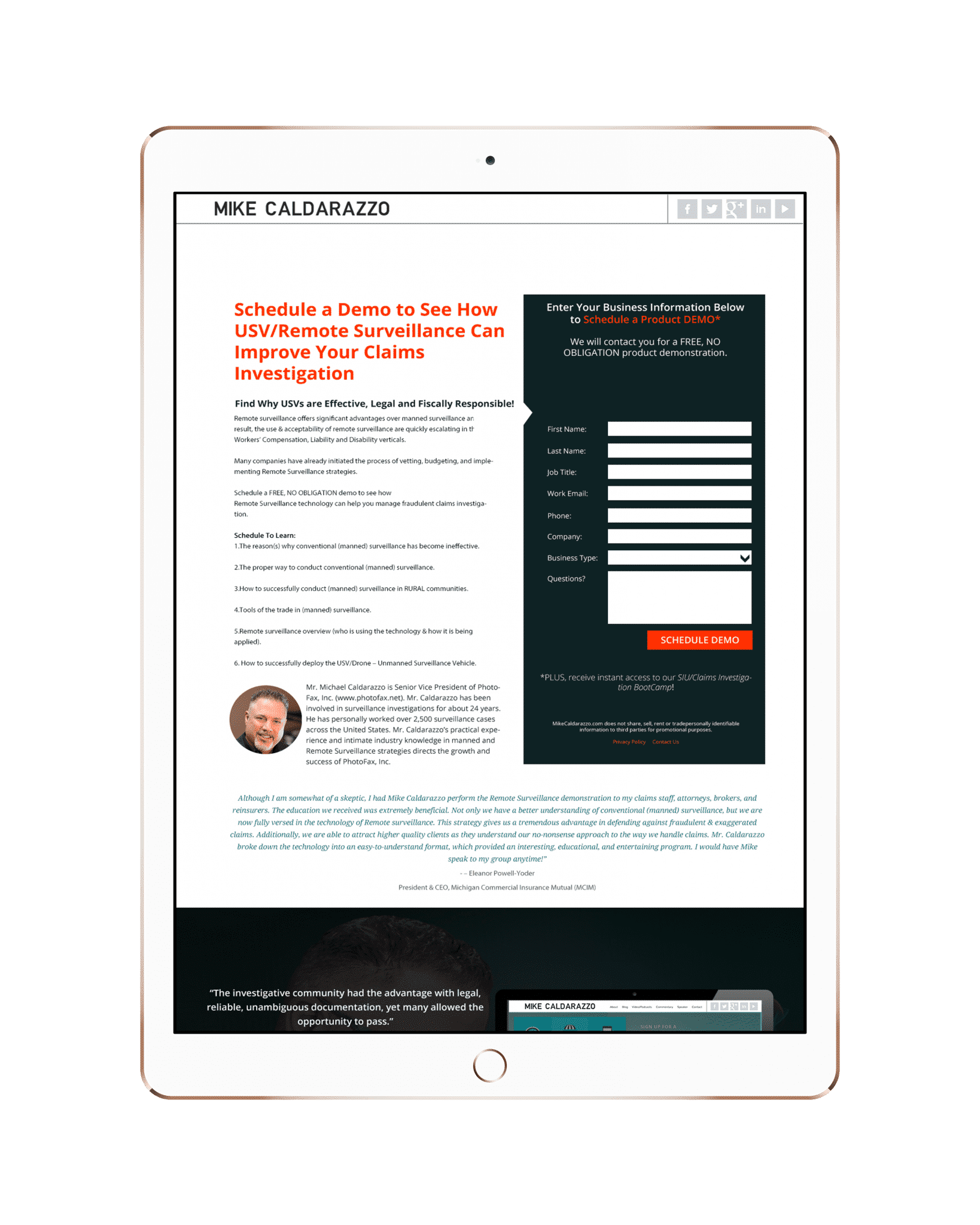 Photofax, Inc. – a leader in investigative services & video surveillance, provides services to insurance companies to aid their claims investigations. We created the website and landing pages for their Executive Director, Mike Caldarazzo, to aid their brand awareness and lead generation efforts.